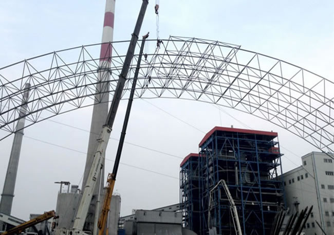 7) 平面鋼桁架的特點(diǎn):常規(guī)的屋面體系為平面受力體系,平面外的剛度及穩(wěn)定靠復(fù)雜的支撐體系來(lái)保證,支撐的桿件強(qiáng)度得不到充分的發(fā)揮,因此耗鋼量大。且桿件類型、規(guī)格繁多,節(jié)點(diǎn)種類多而復(fù)雜。體系傳力路線長(zhǎng),節(jié)點(diǎn)連接部分薄弱,容易應(yīng)力集中,對(duì)抗震及抵抗行車的水平力、約束汽機(jī)房外側(cè)柱均不利。鋼桁架、屋面板自重大,需大型機(jī)械進(jìn)行安裝。